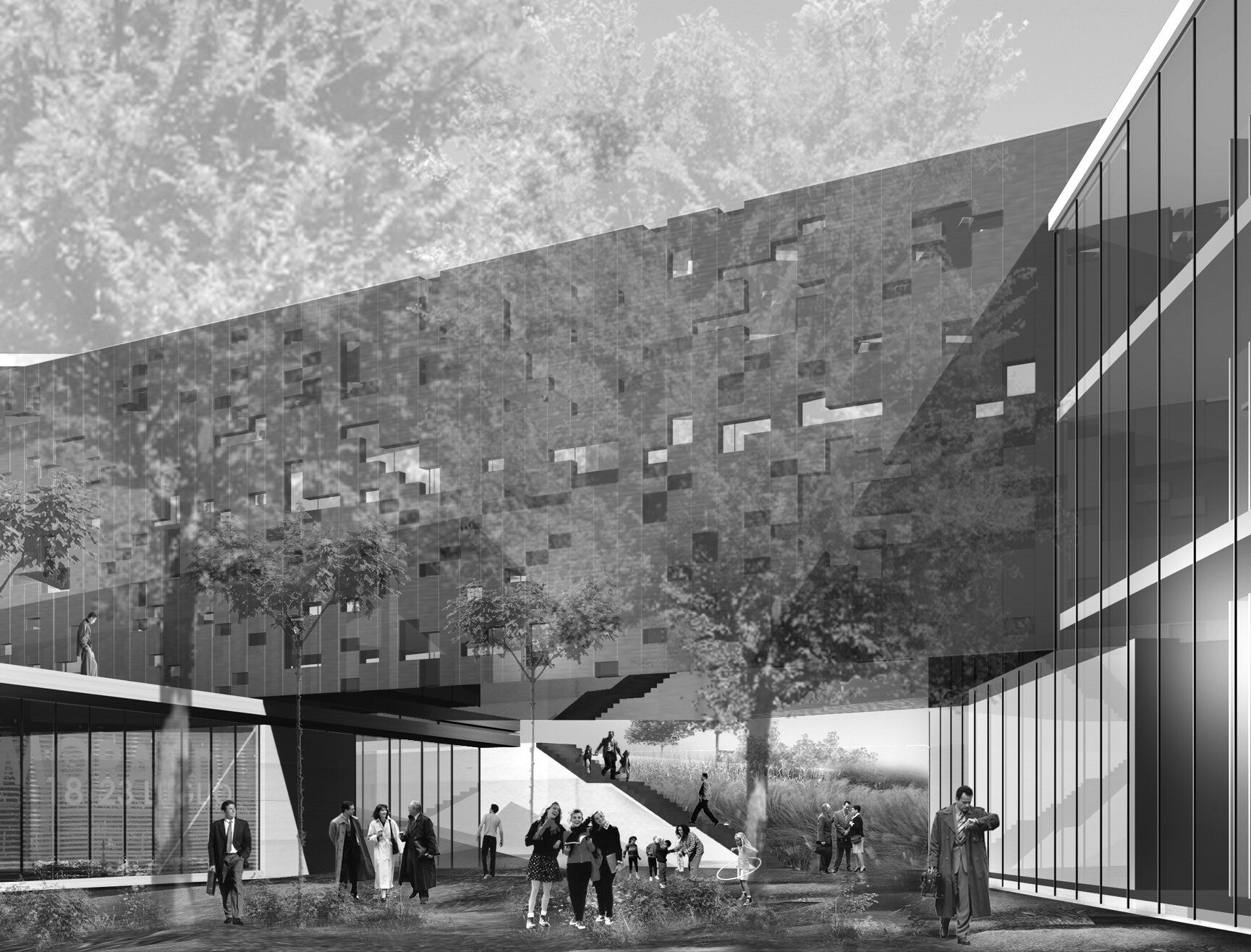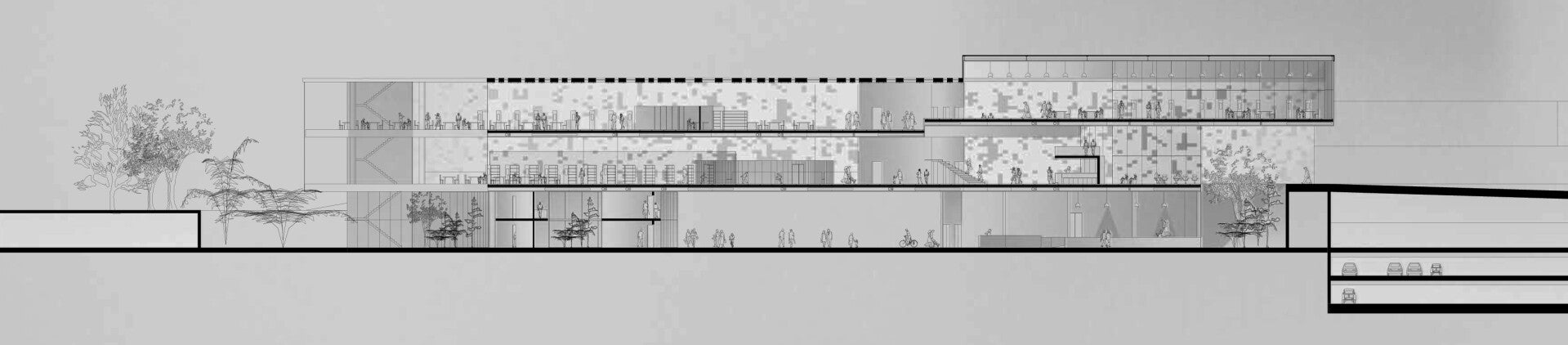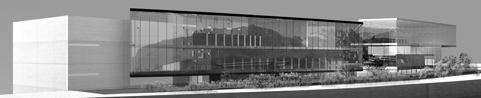 Il progetto crea quindi due diversi ambienti. Il primo, la piazza del mercato con i sottostanti parcheggi, è il luogo vasto del rapporto con i riferimenti lontani della città, del panorama delle montagne. Il secondo è il luogo dei rapporti diretti, della cucitura con il nuovo complesso universitario. La biblioteca àncora la sua forma allungata alla città e seguendo la curva della ferrovia si protende verso il centro urbano. Le pareti compatte del deposito dei libri si svolgono, la grande parete traforata si allunga, seguendo all’interno il flusso dei libri verso le sale e si appoggia al piano inclinato della piazza delimitando l’ingresso. Qui il piano inclinato della piazza fonde i due ambienti e penetrando nell’edificio della biblioteca ne diviene l’atrio. Le sale, disposte su due livelli, sono avvolte dalla medesima parete curvilinea e trasparente. Dall’interno, il rapporto con il paesaggio è totale. All’esterno, il vetro riflette il paesaggio e lo moltiplica.