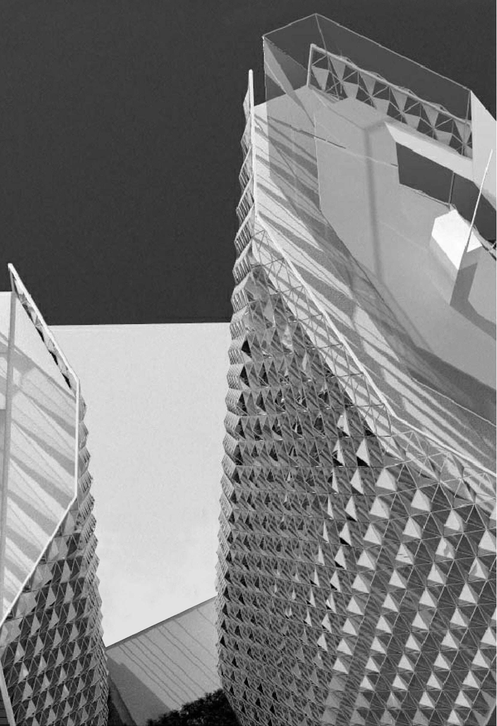 Le facciate, origami di losanghe tridimensionali in acciaio lucido e vetro, si piegano ai lati senza ricongiungersi trattenendo a tutti i piani profonde terrazze. La sfaccettatura delle pareti riflette le differenti cromie della luce, moltiplicandone l’effetto. Di giorno le torri cambiano aspetto al variare delle ore e delle stagioni mentre di notte, grazie all’illuminazione led, si tramutano in “sculture sospese”, suggestivo punto di riferimento per la città. I moduli tridimensionali delle facciate schermano interni di differenti tipologie e dimensioni che, grazie alla razionalità dello schema strutturale e impiantistico, potranno variare nel tempo garantendo agli edifici un largo ciclo di vita in sicurezza ed efficienza.
