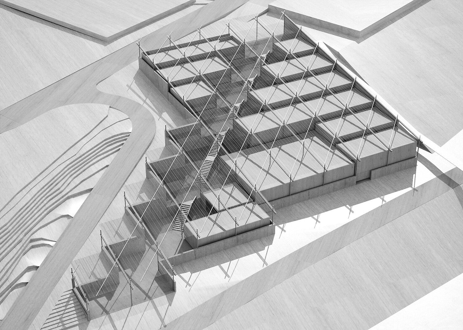 L’idea proposta è conseguente al luogo, un “non edificio” costituito solo da un recinto, una copertura metallica e una serie di alti gradoni in cemento che seguono il declivio naturale ed al tema, spazi di prova e ricerca di danza, musica e teatro per giovani performers: un intervento, quindi, leggero e adattivo per una comunità di nomadi culturali.