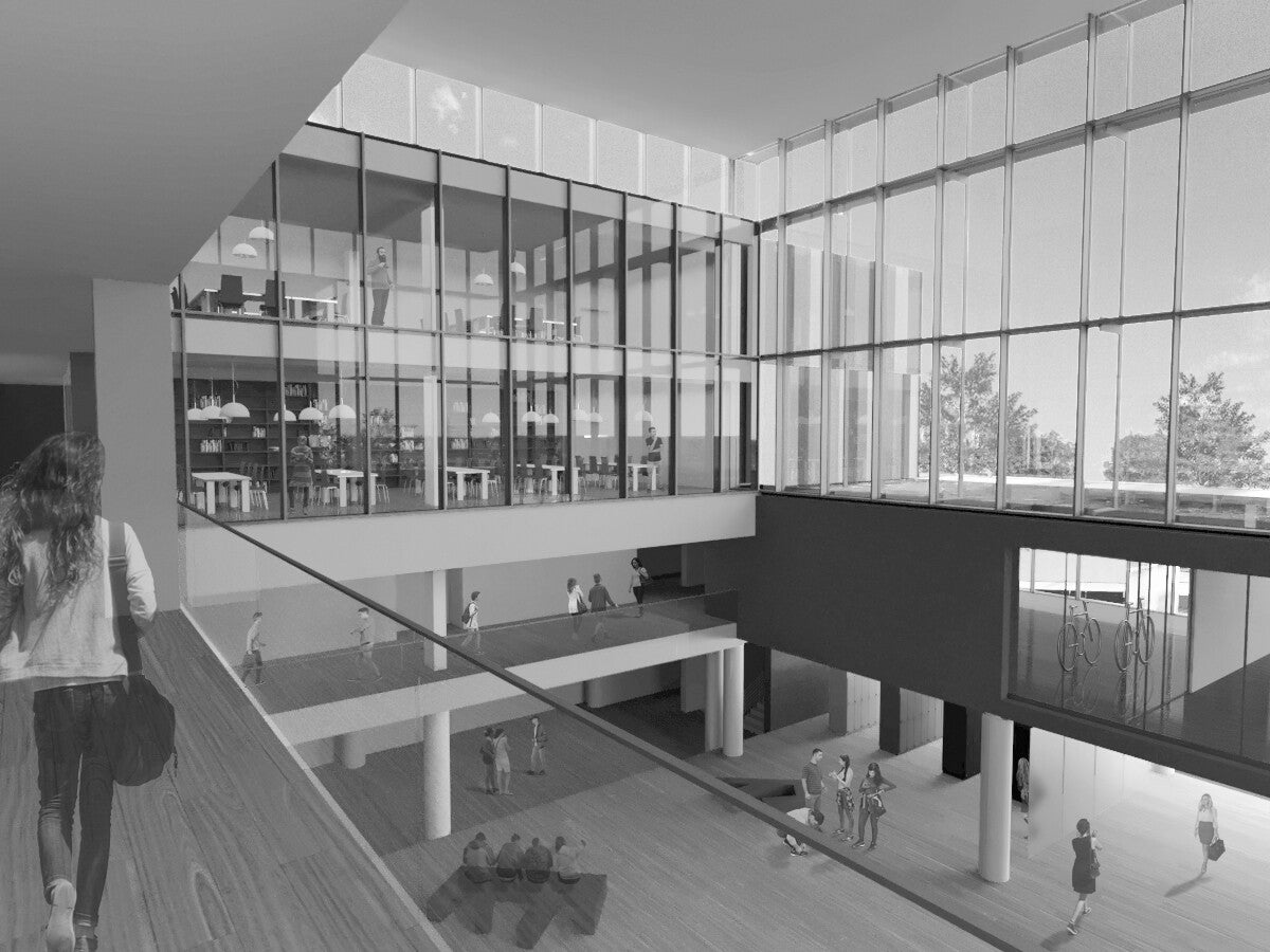 Internamente, il vuoto centrale a tutt’altezza diventa il fulcro delle attività raccogliendo attorno a sé gli spazi di circolazione e dando vita agli ambienti collettivi della biblioteca e delle sale multimediali. Dal piano terra, la gradonata conduce al giardino pensile ricongiungendo i flussi interni agli spazi aperti al pubblico in un fisico e non solo ideale percorso circolare.