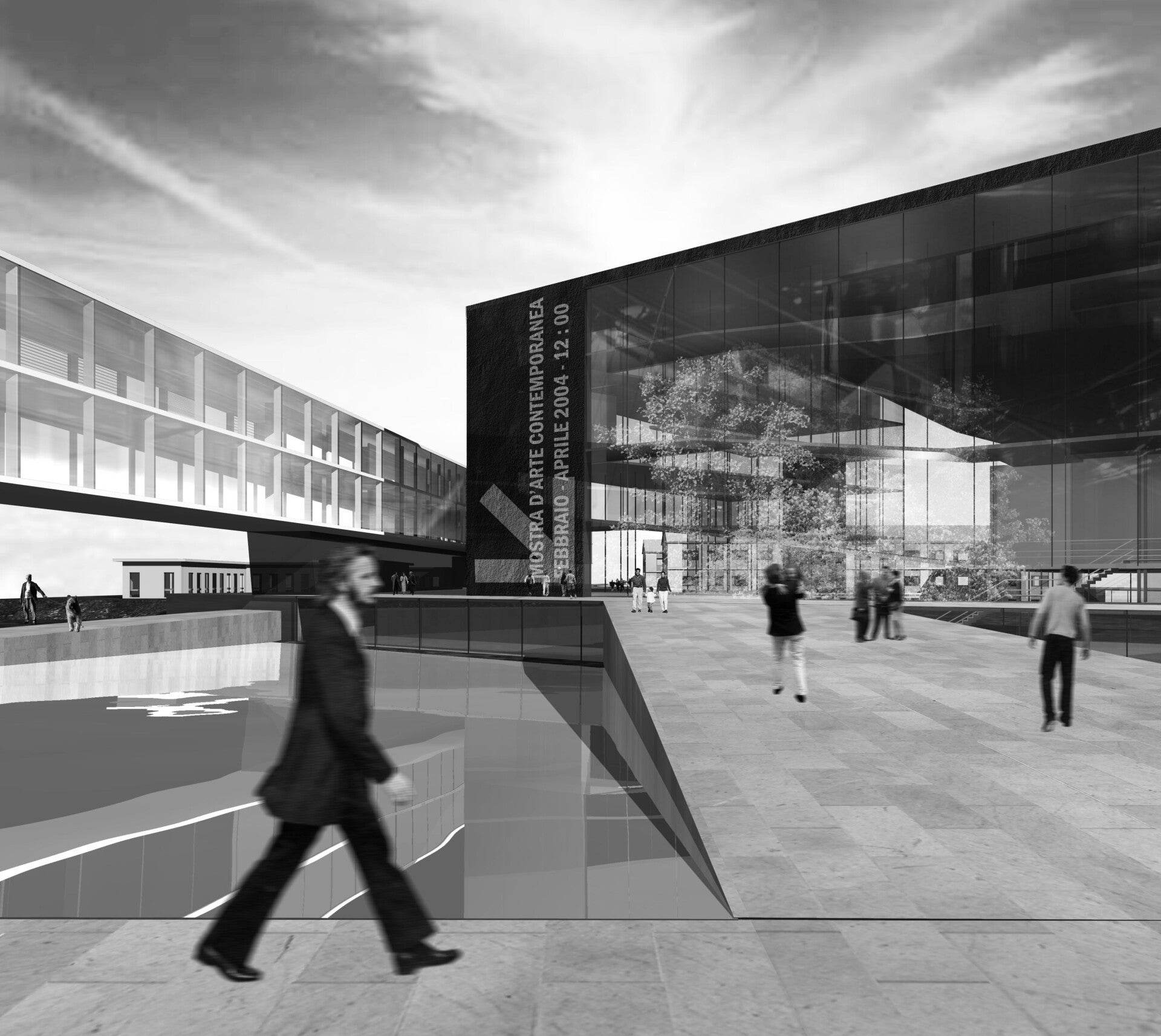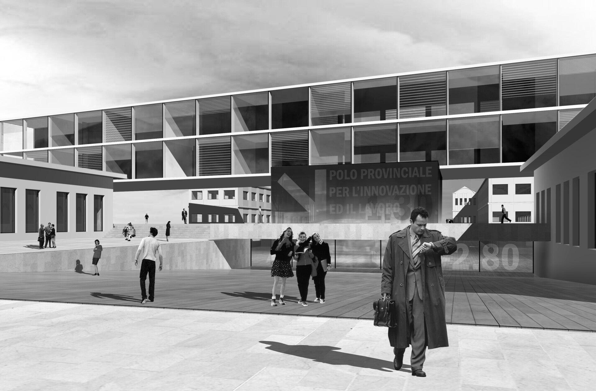 La piastra dei nuovi centri e delle attività comuni connette gli eterogenei edifici esistenti dilatandosi in un sistema di spazi di vita a contatto con il verde dei giardini. Dalla sua superficie dura e percorribile integrata nel disegno del verde emergono, nette e precise, le nuove volumetrie. Dal centro degli edifici esistenti si stacca, lunghissima, la “barra” del centro di formazione della moda. Volume trasparente e quasi sospeso attraversa i due terzi dell’area animandone i differenti ambienti e denunciando alla scala urbana, in una dimensione dinamica e progressiva, la presenza viva del Polo.