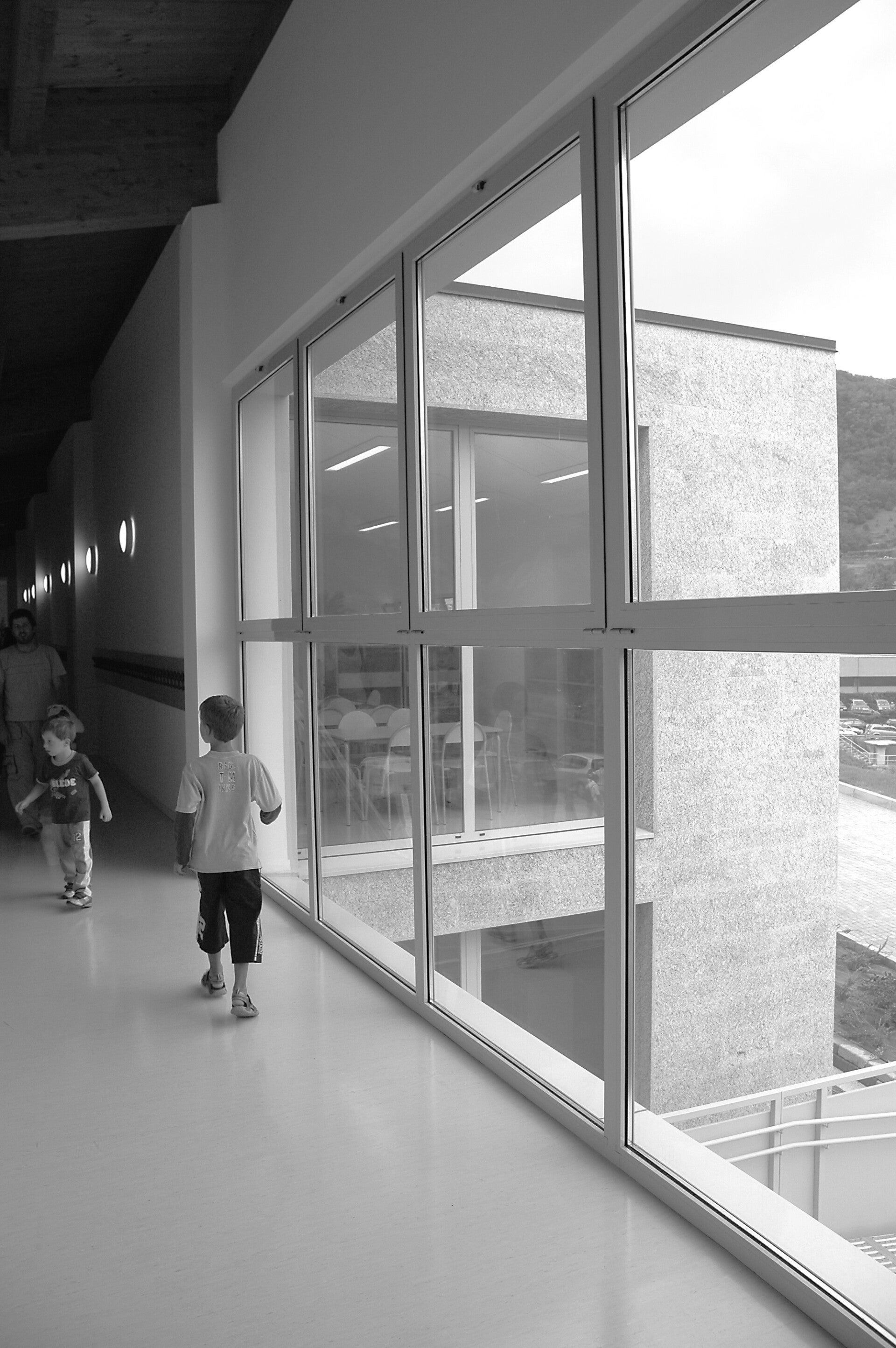 All’interno della composizione, i muri in pietra degli edifici lasciano il posto ad ampie vetrate a tutta altezza, che si aprono verso la valletta, generando un rapporto osmotico tra interno e esterno. Cerniera compositiva e funzionale dell’intero intervento architettonico è l’atrio. Disposto su due livelli, si colloca nel punto di intersezione tra le due direttrici del terreno, secondo cui si dispongono i volumi, e distribuisce i flussi con scale “lanciate” verso la vetrata a sud. La compressione della zona di ingresso, posta alla quota più alta del terreno, trova quindi sfogo nella doppia altezza dell’atrio e, attraverso la vetrata, nello spazio della corte. In questo ambito protetto si inserisce l’edificio della scuola dell’infanzia, che, pur legato all’intero complesso, riesce ad avere un funzionamento autonomo ed una relazione più diretta con gli spazi verdi.