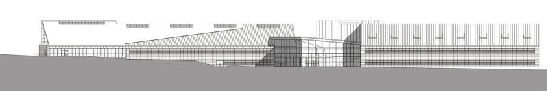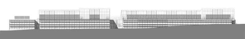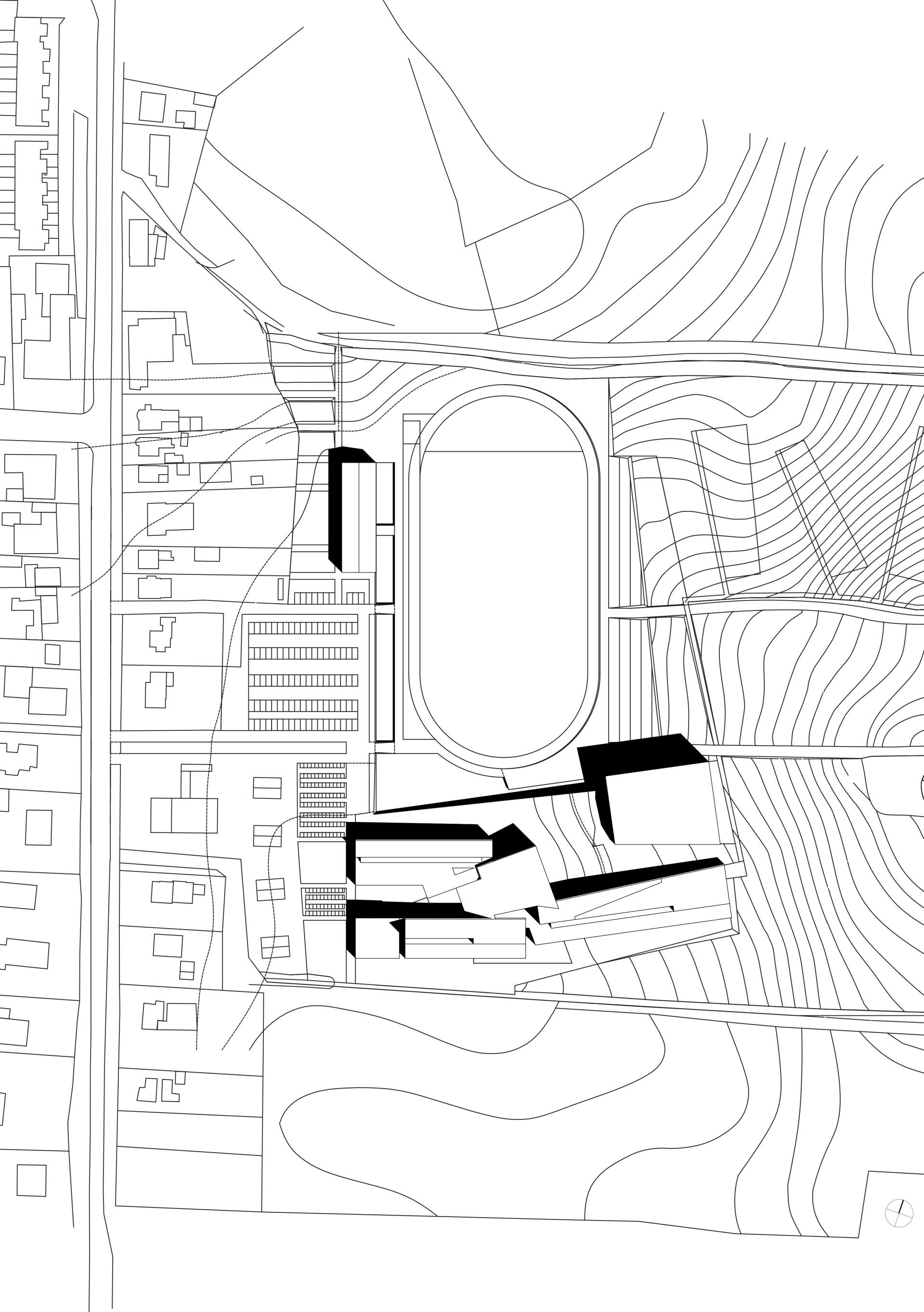 I volumi si concentrano nel settore meridionale dell’area, lasciando a nord la zona sportiva, interpretata come elemento piano, neutro, in cui i due paesaggi si affacciano, dialogando tra di loro. Da un lato le curve di livello si addensano raccogliendo le ondulazioni del terreno in un margine duro a gradoni, dall’altro il tessuto urbano prospetta sotto forma di quinta verde discontinua. I volumi costruiti richiudono a sud l’invaso della grande “piazza sportiva” con forme allungate nella direzione est-ovest.