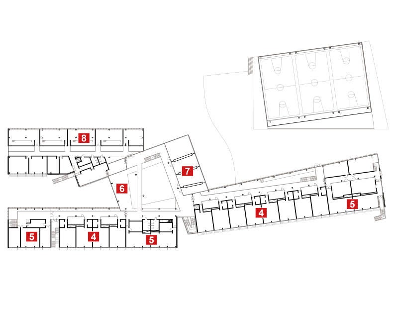 A contatto con la città, ne reinterpretano le regole morfologiche e ne prolungano la trama disponendosi perpendicolarmente all’asse stradale; verso la collina, invece, si deformano nella loro articolazione planimetrica e nei loro profili, piegandosi e fondendosi parzialmente con essa. Fulcro della composizione architettonica ed elemento di mediazione tra esterno e interno, l’atrio raccoglie la rete dei percorsi degli edifici in un volume a doppia altezza, che si proietta visivamente verso il paesaggio agricolo e si prolunga all’esterno nei tre cortili della scuola.